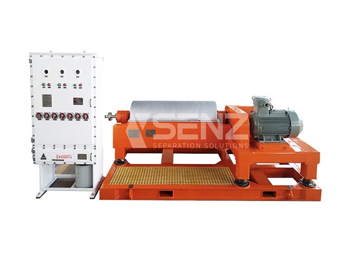 转鼓与螺旋以一定差速同向高速旋转,物料由进料管连续引入输料螺旋内筒,加速后进入转鼓,在离心力场作用下,较重的固相物沉积在转鼓壁上形成沉渣层。输料螺旋将沉积的固相物连续不断地推至转鼓锥端,经排渣口排出机外。较轻的液相物则形成内层液环,由转鼓大端溢流口连续溢出转鼓,经排液口排出机外。本机能在全速运转下,连续进料、分离、洗涤和卸料。